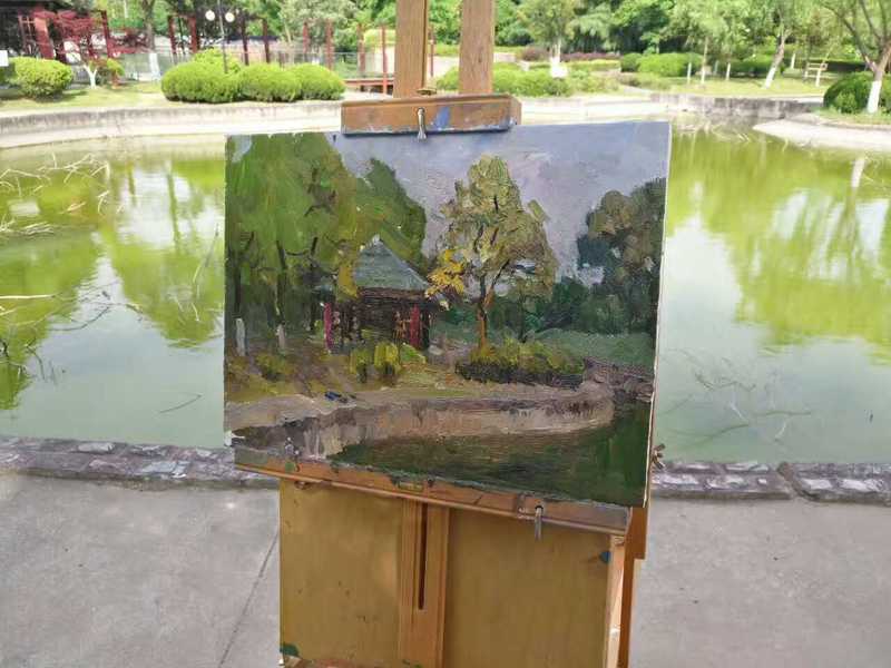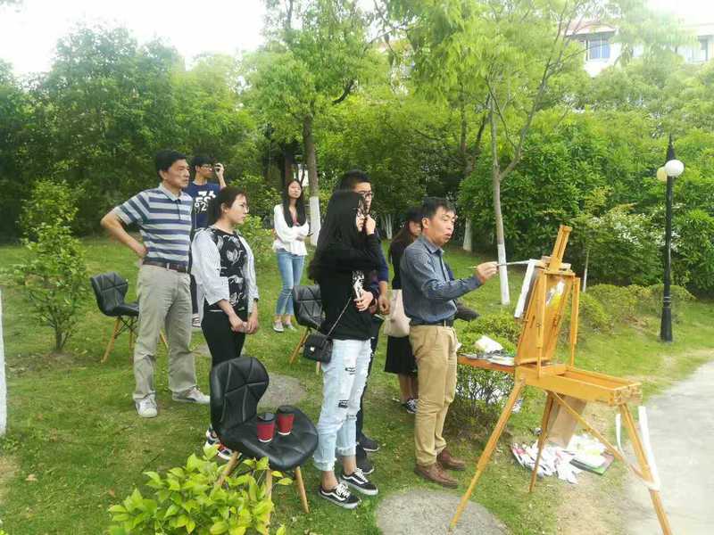 下午,张教授来到闵行校区自强园进行风景示范写生,让大家对油画风景写生的技法有了更深入更直观的了解。写生过程中张教授边画边讲解,他说:“忠诚于眼前之景,才能保持画面的鲜活性。写生作品应该画得自然、抒情、放松些,做到恰到好处,见好就收。”张教授将自然质朴的美绘于笔下,将内心深处宁静的情怀露于笔端。明快稳重的色彩和生动的笔触,透露出其敏锐的观察力和表现力。“追求艺术的至真、至善、至美”,艺术在身边,亦在笔际心间。