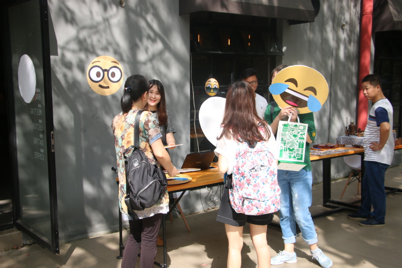 之后,新生们走到了我们精心布置的表情包主题街区,愉快的拍照留念,并参观了我们自主设计制作的纪念品。