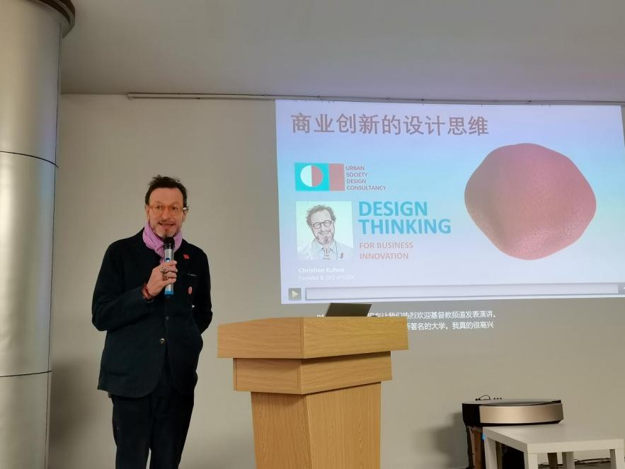Christian Kuhna老师做国际化系列讲座的第二讲《Design thinking for product innovation》。Christian老师在戴姆勒、西门子及阿迪达斯等全球领先品牌有二十余年的创新实践经历,对数字化、人工智能和创新设计领域有独特的见解,与同济大学、上海交通大学等均有教学合作项目。讲座中,Christian Kuhna老师基于数字化和人工智能时代设计师的社会角色和心态出发,深入浅出介绍了产品创新设计思维的步骤以及具体的实践方法。在此过程中,Christian老师就如何以情动人进行情感化设计展示了丰富的案例。最后建议同学们在全球化背景下,应该学会将中国文化融入产品设计,保持热爱和好奇心,在日常工作学习中培养创新能力。讲座在热烈的互动氛围中结束。