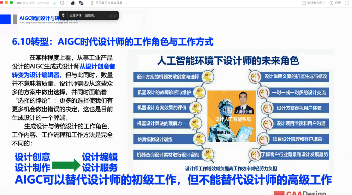 中国美术公司博士生导师、人工智能设计领域著名学者范凯熹教授应邀作开班导学讲座。范教授以前瞻性视角,高屋建瓴地拓展了学员对设计的认知边界。在题为"AIGC工具赋能设计与研究的变革"的专题讲座中,范教授深入浅出地阐述了AIGC的定义与具体应用,探讨了新时代设计师的生存与发展之道。他系统剖析了人工智能时代设计领域的新趋势与新思路,明确指出未来"设技融合"的发展方向。讲座结束后,同学们踊跃与范教授互动交流,在思维碰撞中获益良多。