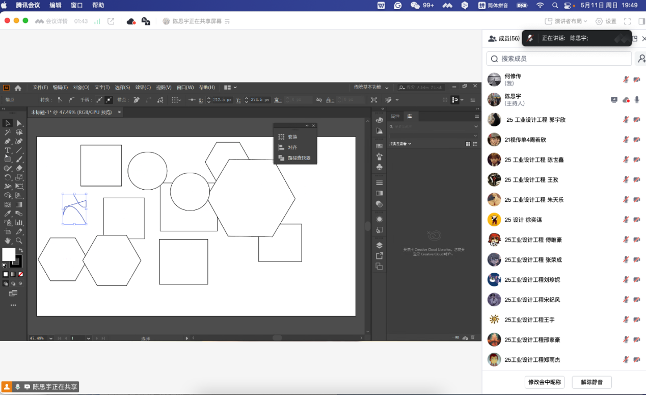 5月11日,课程进入Illustrator软件教学阶段,由陈思宇同学担任主讲。她不仅详细讲解了软件操作技能,还创新性地融入了平面构成与色彩构成的专业知识,有效强化了跨学科设计思维。陈思宇从学习者视角出发,结合自身兴趣精选国内外优秀案例,将技术讲解与创意实践有机融合,营造出活跃的课堂氛围。同学们积极参与互动交流,充分体现了"以员工为中心"的教学成效
